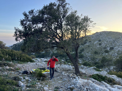 Plníme vaky vodou a batohy zase těžknou. Další tři hodiny máme před sebou. Terén je už vlídný, olivovníky nás vítají, ale mám toho dneska nějak plné zuby. Do plánované refugie dorážíme až kolem sedmé. Jenomže mají plno a u ní se stanovat nemůže. Takže jdeme zpátky a hledáme mezi kameny po cestě rovný plácek na spaní. Musíme se rozdělit. Není tu dost místa, aby tu na jednom místě spali všichni vedle sebe. Takže jedni spí u cesty, druzí u rozcestníku a my objevujeme kamenitý placek se zídkou, odkud je krásně vidět na moře.
